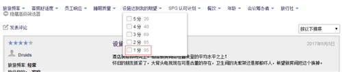 挖掘細節(jié),我們發(fā)現(xiàn):設(shè)施老化是非常重要的影響因素。在SPG官網(wǎng)點評的315位顧客中,評1分的人最多,達到95位;3分以下的達到180位,占比57.14%。