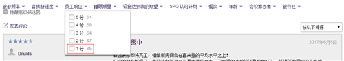 另外,員工的響應(yīng)也是廣受詬病的。在SPG官網(wǎng)點評的315位顧客中,同樣是評1分的最多,達到85位;3分以下的達到132位,占比41.9%。