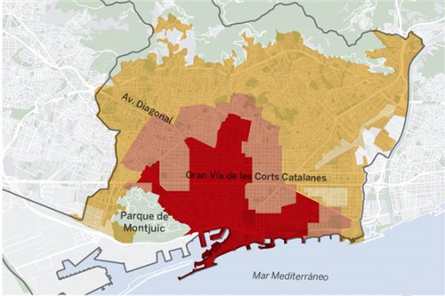 巴塞羅那市區(qū)被劃為四大塊(如圖所示),以深紅、淺紅、深黃和淺黃四色劃分,顏色越深,酒店業(yè)限制越嚴(yán)厲。