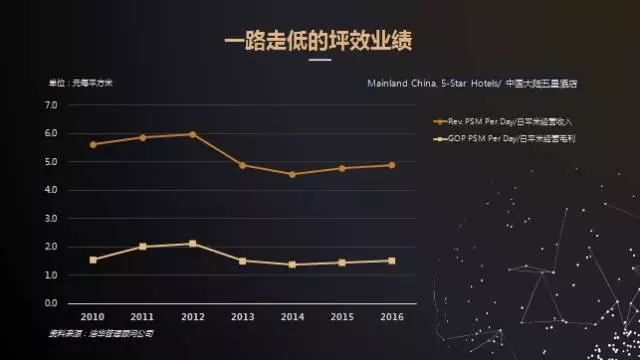 從具體數(shù)字上看,五星酒店的坪效基本徘徊在低位,尤其是以經(jīng)營(yíng)毛利計(jì)算時(shí)。依據(jù)與中國(guó)旅游飯店業(yè)協(xié)會(huì)共同發(fā)布的《中國(guó)飯店業(yè)務(wù)統(tǒng)計(jì)》,過(guò)去7年,中國(guó)五星級(jí)酒店的每日每平米經(jīng)營(yíng)收入介于人民幣4.5元至6元之間,每日每平方米經(jīng)營(yíng)毛利低至人民幣1.4至2.1元。