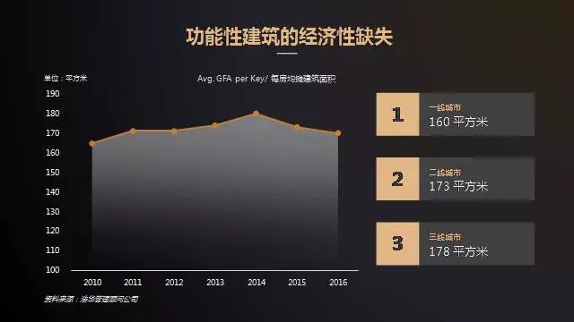 數(shù)據(jù)顯示,自2010年開(kāi)始,五星級(jí)酒店的每間房均攤建筑面積持續(xù)高于170平方米,且越低層級(jí)的城市,均攤面積越高,在三線城市,該指標(biāo)甚至高達(dá)180平方米。居高不下的建筑面積不僅需要高昂的建造成本,也導(dǎo)致運(yùn)營(yíng)成本的進(jìn)一步增長(zhǎng),尤其是一些追求標(biāo)新立異建筑外形的酒店,高能耗成本始終是成本管控的一道難題。