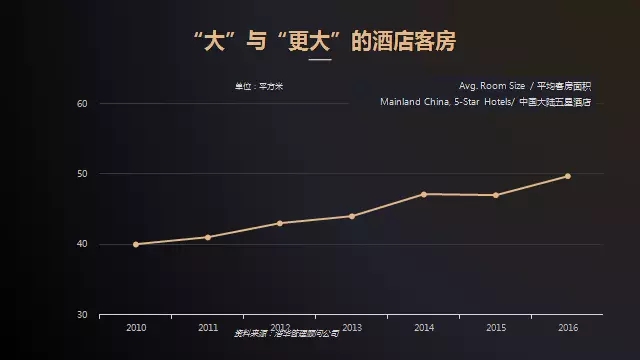 現(xiàn)實(shí)的數(shù)據(jù)表明中國(guó)市場(chǎng)一直在追逐著“大”與“更大”的游戲。五星級(jí)酒店的平均客房面積逐年上漲,從2010 年的每房40平方米持續(xù)上升至2016年的50平方米。盡管最近兩年更趨理性、更重財(cái)務(wù)回報(bào)的酒店投資趨勢(shì)開(kāi)始出現(xiàn),但這一趨勢(shì)顯現(xiàn)的效果仍有一定的滯后性。隨著最近5年規(guī)劃的高檔酒店逐漸落地,我們看到未來(lái)短期內(nèi)客房面積依然有小幅上揚(yáng)的趨勢(shì)。