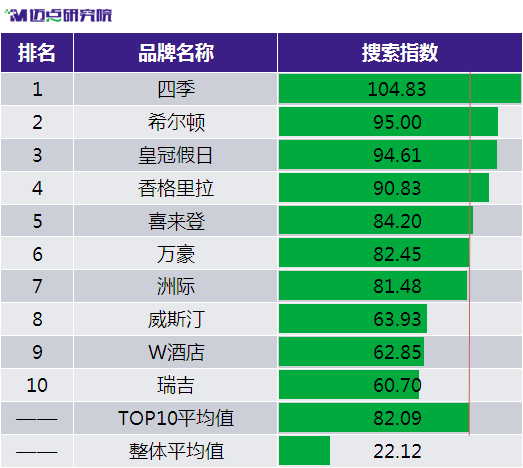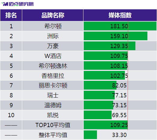 2017年11月,根據(jù)邁點(diǎn)研究院(MTA)對(duì)國(guó)際高端酒店品牌品牌指數(shù)的不完全統(tǒng)計(jì),本月國(guó)際高端酒店品牌風(fēng)云榜TOP10依次是希爾頓、洲際、香格里拉、喜來登、萬豪、皇冠假日、希爾頓逸林、四季、威斯汀、W酒店。
