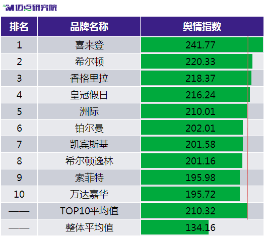 輿情指數(shù)上,本月共有8家酒店品牌的指數(shù)值突破200,而國(guó)際高端酒店品牌的整體輿情指數(shù)也達(dá)到了134.16,可見市場(chǎng)對(duì)于國(guó)際高端酒店的認(rèn)可度相對(duì)較高。TOP10品牌中,喜來登依然處于領(lǐng)先優(yōu)勢(shì)。