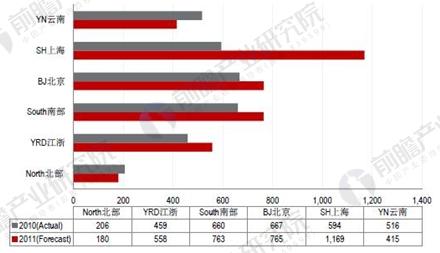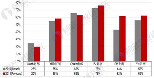 在入住率方面,我國南部地區(qū)精品酒店的入住率遠高于北部地區(qū),兩者2011年入住率分別是63%和20%。從重點城市來看,北京的精品酒店入住率最高,在75%左右;其次是云南和上海,其入住率在2011年上升較快,均達到62%;浙江2011年的精品酒店入住率為58%。