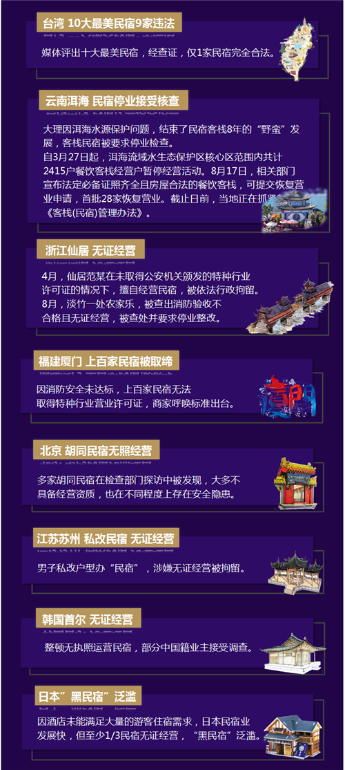 民宿業(yè)從“摸石頭過河”轉(zhuǎn)為“有規(guī)可循”的經(jīng)營管理狀態(tài),仍會(huì)出現(xiàn)“適應(yīng)不良”的問題。2017年,有多家民宿因無證經(jīng)營、消防驗(yàn)收不合格、將商品房私改民宿等被相關(guān)部門查處并要求停業(yè)整治。