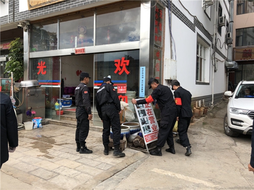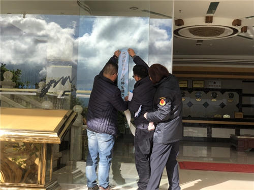 專項(xiàng)整治工作人員在經(jīng)營戶門上貼封條