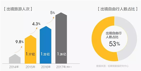 2017年全年中國公民出境游人次將達(dá)到1.28億人次,相當(dāng)于日本總?cè)丝?,同?016年增長(zhǎng)接近5%。其中,出境自由行人數(shù)占比53%。