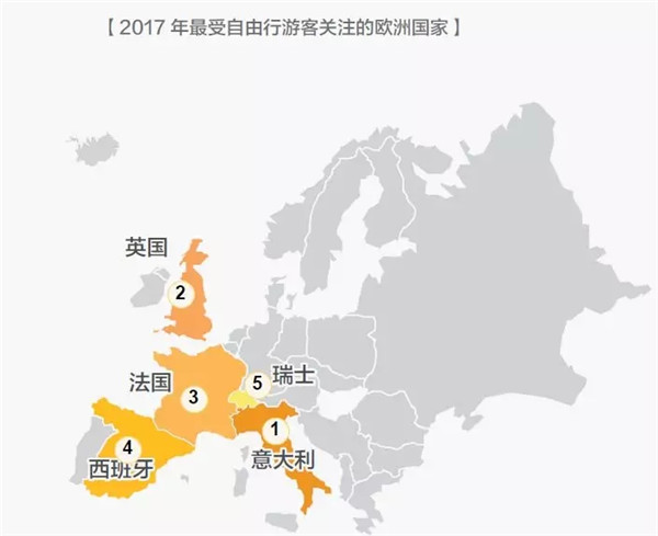 2017年最受自由行游客青睞的歐洲旅游目的地分別是意大利、英國、法國、西班牙和瑞士。其中,由于意大利、法國和瑞士相近,多自由行游客會(huì)在規(guī)劃行程時(shí)選擇“法意瑞”游玩路線,在15天左右的時(shí)間里玩轉(zhuǎn)三個(gè)國家。
