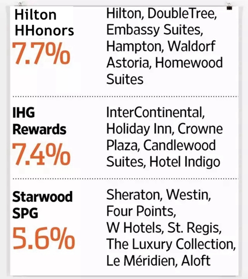 第四位是希爾頓的HiltonHHonors,7.7%,品牌有逸林、漢普頓、Embassy Suites等。