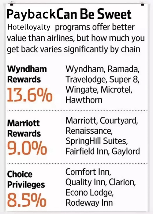 Scott McCartney比較后認(rèn)為,溫德姆酒店集團(tuán)(Wyndham Hotel Group)的忠誠(chéng)獎(jiǎng)賞計(jì)劃是目前表現(xiàn)最好的。溫德姆酒店集團(tuán)擁有超過7800家經(jīng)濟(jì)型酒店、四星中檔酒店、海灘度假村和五星級(jí)豪華酒店,品牌有華美達(dá)、戴斯、速8等。