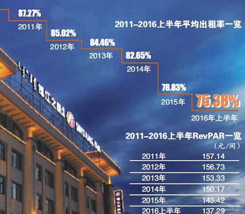 據(jù)公開資料,錦江之星旅館有限公司于2010年由H股回歸錦江股份A股。據(jù)2011年年報(bào),錦江之星的平均出租率為87.27%,此后逐年下滑,到2015年時(shí)已降至78.83%。據(jù)2016年半年度報(bào)告顯示,2016年上半年錦江之星的平均出租率進(jìn)一步減少為75.38%。