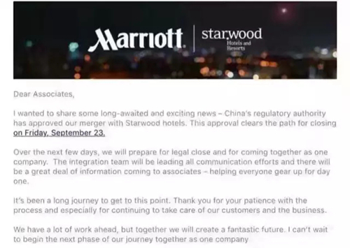 2016年9月20日,萬豪國際發(fā)表聲明稱,中國商務(wù)部已經(jīng)批準(zhǔn)其收購喜達(dá)屋酒店及度假村國際集團(tuán)的交易。