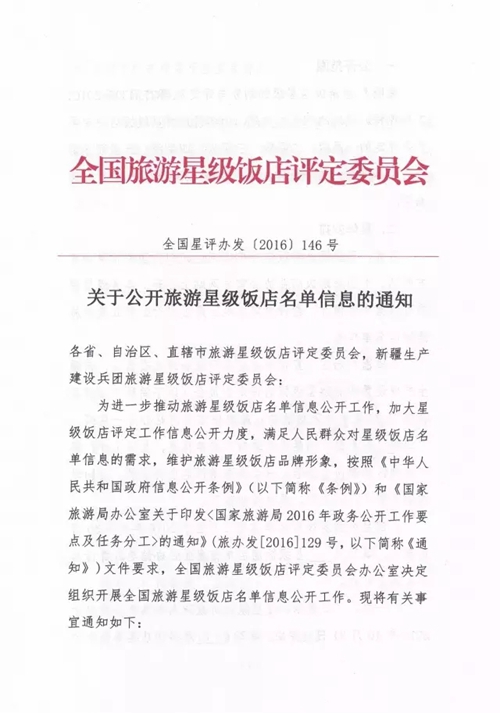 日前,全國星評辦下發(fā)《關(guān)于公開旅游星級飯店名單信息的通知》,組織各省、自治區(qū)、直轄市旅游星級飯店評定委員會,新疆生產(chǎn)建設(shè)兵團(tuán)旅游星級飯店評定委員會開展全國旅游星級飯店名單信息公開工作。這意味著某飯店幾星級、所在地區(qū)、星級標(biāo)牌編號今后都將“上網(wǎng)可查”。