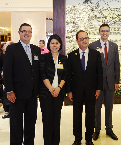 2016年9月4日,雅高酒店集團(tuán)大中華區(qū)區(qū)域餐飲總監(jiān)/山東區(qū)域營(yíng)運(yùn)總監(jiān)柯瑞文(左一)、杭州索菲特西湖大酒店總經(jīng)理范斯先生(右一)和酒店業(yè)主代表/副總經(jīng)理竺麗萍女士(左二)于酒店大堂歡迎法國(guó)總統(tǒng)弗朗索瓦•奧朗德。