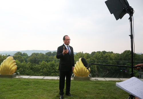 2016年9月4日下午2點(diǎn)10分,法國(guó)總統(tǒng)弗朗索瓦•奧朗德在索菲特會(huì)所酒廊戶外露臺(tái)接走媒體采訪。