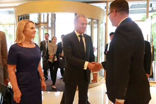 2016年9月3日下午5點(diǎn),雅高酒店集團(tuán)大中華區(qū)區(qū)域餐飲總監(jiān)/山東區(qū)域運(yùn)營(yíng)總監(jiān)柯瑞文、杭州索菲特西湖大酒店總經(jīng)理范斯先生和酒店業(yè)主代表/副總經(jīng)理竺麗萍女士,于酒店正門口熱情迎接歐洲理事會(huì)主席唐納德·圖斯克與他的夫人瑪烏格熱塔。
