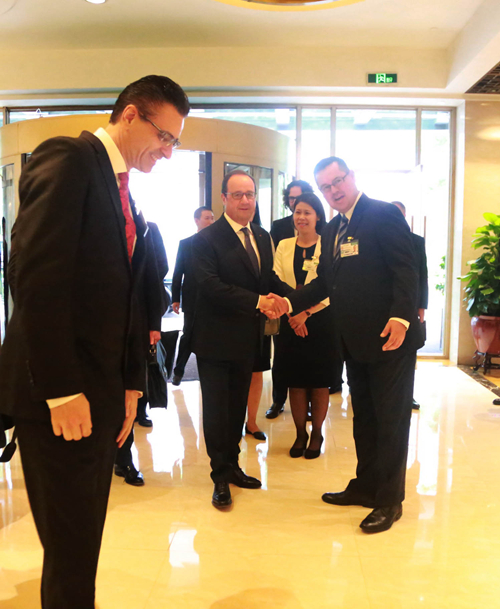 2016年9月4日下午12點(diǎn)30分,雅高酒店集團(tuán)大中華區(qū)區(qū)域餐飲總監(jiān)/山東區(qū)域運(yùn)營(yíng)總監(jiān)柯瑞文、杭州索菲特西湖大酒店總經(jīng)理范斯先生和酒店業(yè)主代表/副總經(jīng)理竺麗萍女士,于酒店正門口熱情迎接法國(guó)總統(tǒng)弗朗索瓦•奧朗德。