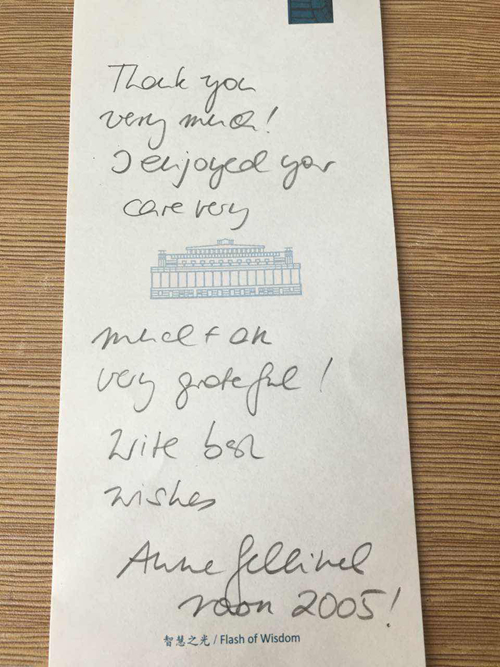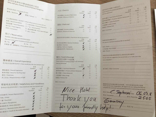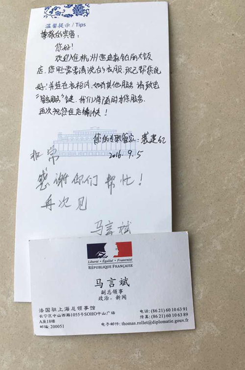 除了在店內(nèi)留下的感謝信、感謝留言之外,外媒記者離店后還專門向酒店發(fā)來感謝郵件,其中有法國駐上??傤I(lǐng)事館副總領(lǐng)事Thomas ROLLET(馬彥斌)、德國駐京記者一處資深記者陳女士、香港鳳凰衛(wèi)視新聞制作部郭女士等。