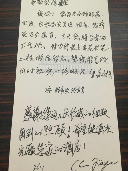 據(jù)了解,酒店管家部推出了一項“貼身管家團隊”服務(wù),雖然只作為整體接待方案的一部分,但是將人文關(guān)懷發(fā)揮到得淋漓盡致。“貼身管家團隊”在接待期間總能非常細(xì)致的關(guān)注到賓客的需求:如為記者朋友提供鼠標(biāo)墊,并寫下溫馨的留言便簽;為德國賓客送上鞋架,便于鞋子擺放整齊;為意大利客人縫補并熨燙西裝;贈送了9月2日到店的意大利記者中國臉譜書簽等等。這些小小細(xì)節(jié)的關(guān)注,為境外媒體記者帶來了溫暖和驚喜。樓層員工小張表示,讓賓客滿意是基礎(chǔ),創(chuàng)造驚喜是追求,希望每一位媒體記者在住店期間都能感受到我們殷勤好客的熱情和細(xì)致入微的服務(wù)。接待期間,“貼身管家團隊”共收到了書面感謝信37件,贏得境外媒體的廣泛好評。