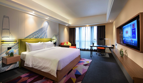 例如在客房的設(shè)計(jì)上,沿用希爾頓歡朋國(guó)際標(biāo)準(zhǔn)的“Hampton Bed®”的同時(shí),床背板以及洗手間門板的裝飾畫均選用了當(dāng)?shù)氐貥?biāo)建筑的藝術(shù)化作品。在整體設(shè)計(jì)的色彩運(yùn)用上,國(guó)內(nèi)的希爾頓歡朋酒店的色彩更加繽紛、明亮,給客人一種現(xiàn)代時(shí)尚的感覺。