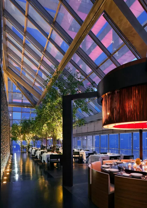 北京銀泰中心為北京柏悅酒店創(chuàng)造了 63 層大堂吧及前臺(tái)、65 層亮餐廳和亮酒吧 360 度視角看北京的可能,大褲衩隨便拍,中軸線就在眼底,尤其入夜后,主樓頂部“中國(guó)燈籠”造型燈光璀璨,如燈塔般光芒四射。