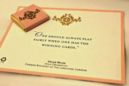 天津利順德大飯店始建于1863年,曾經(jīng)接待過眾多全球領(lǐng)導人并見證過許多標志性的活動,因其引以為傲的歷史被稱為“外交酒店”。酒店的夜床禮物是將飯店一百五十余年歷史融入其中的紀念版明信片或下榻過酒店的孫中山、胡佛、張學良,梅蘭芳等歷史名人紀念書簽。每天一張不同的明信片或歷史名人書簽,幸運的客人會集齊一套。