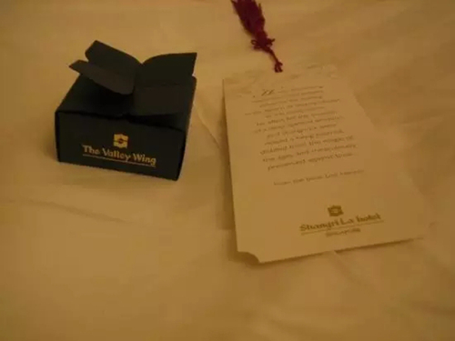 每家香格里拉酒店的床頭柜里都會有一本《消失的地平線》這已經(jīng)不是秘密,這也是香格里拉集團的拳頭理念。在靜安香格里拉,還會夜床拆口處放置一枚香格里拉書簽(書簽文字摘自《消失的地平線》),給賓客帶去平靜悠遠的感覺。