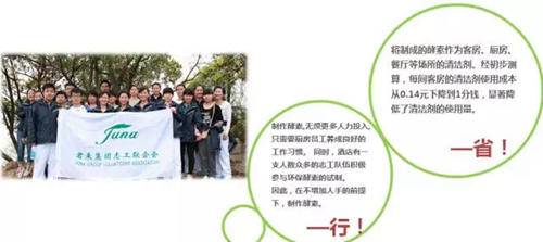 該飯店總經(jīng)理曹蘭蘭說:“原來我們用清潔劑清潔客房,平均下來每一間房間花費0.14元,現(xiàn)在用了酵素后下降到了0.01元?!痹瓉?,酵素是一種酶,具有凈化和抗菌的功能。無錫君來湖濱飯店以每天用剩的大量的果皮和蔬菜為原料,加上黑糖或者紅糖制作成酵素清潔劑,應用在客房、公共區(qū)域衛(wèi)生間、廚房、地面、墻磚的清潔上,既衛(wèi)生又環(huán)保。“這種變廢為寶,不僅減少了垃圾的排放,還為飯店節(jié)省了大量清潔費用,這一飯店環(huán)保節(jié)支的新嘗試值得我們學習?!倍辔慌c會嘉賓表示。