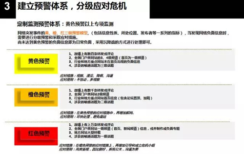劉蕾認為,酒店要從根本上提升風險防控能力,把危機隱患扼殺在萌芽狀態(tài),而不是后續(xù)應對??蓪⑤浨轱L險評估納入日常風險評估中;實行輿情風險通知單制度;全面總結(jié)酒店業(yè)輿情風險類型;重要決策、項目、活動前開展風險評估等?!熬频陿I(yè)的很多重大投訴都發(fā)生在夜晚、凌晨時分,酒店平時就要培訓、訓練員工監(jiān)測應對輿情,建立黃色、橙色、紅色預警分級管理體系,科學分析研判,分級應對,把輿情管理工作常態(tài)化。