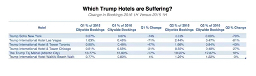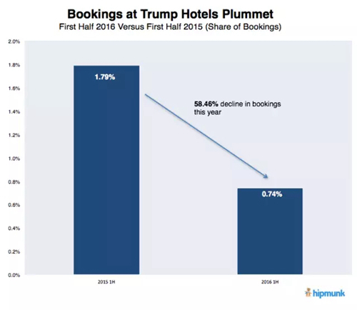 據(jù)美國旅游搜索網(wǎng)站Hipmunk統(tǒng)計(jì),2016年上半年全美的特朗普酒店預(yù)訂數(shù)量的市場(chǎng)份額同比減少58%,可以說是暴跌。該網(wǎng)站的用戶多為城市地區(qū)的年輕人,似乎在特意避開特朗普品牌。