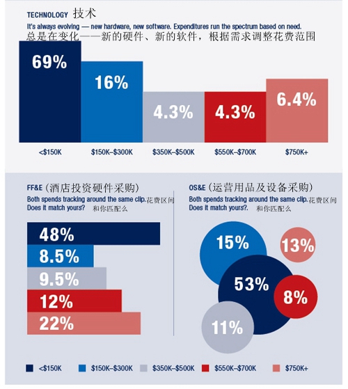FF&E(酒店投資硬件采購)方面,和技術(shù)一樣在支出的基礎(chǔ)上有所突破。雖然約48%的受訪者表示他們將花費(fèi)不到15萬美元,但22%的受訪者表示他們將花費(fèi)超過75萬美元。 較少的受訪者,約12%表示他們將在FF&E上花費(fèi)55萬美元到70萬美元。 同時,超過一半的人表示他們在OS&E(運(yùn)營用品及設(shè)備)上花費(fèi)不到15萬美元。