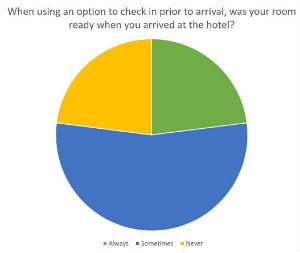 23%使用移動端辦理入住的旅客表示,他們“從來沒有”發(fā)現(xiàn)到達后客房可立即入住。54%的客人表示客房“有時”是已經(jīng)準(zhǔn)備好可隨時入住的。