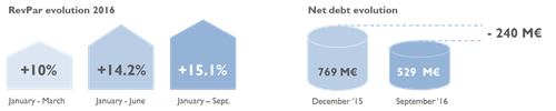 2、第三季度的強(qiáng)勁勢(shì)頭、十月業(yè)務(wù)的出色表現(xiàn)以及第四季度的預(yù)訂讓集團(tuán)維持了2016年每間客房可用收益預(yù)計(jì)增長(zhǎng)在中上程度的范圍內(nèi)(80%歸功于價(jià)格的調(diào)節(jié)改善)