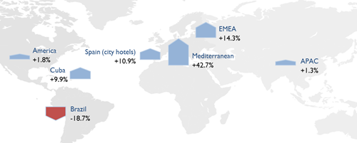 在西班牙中部,馬德里的每間客房可用收益相較去年獲得了兩位數(shù)的增長(zhǎng),表現(xiàn)出色的有Tryp Gran Vía, Meliá Galgos以及位于機(jī)場(chǎng)附近的酒店。位于西班牙東部的酒店獲得了將近1,300萬(wàn)的收益增長(zhǎng),其中40%來(lái)自于第三季度,許多適合商務(wù)出行及休閑旅游的地區(qū)得益于假日的積極影響,如阿利坎特,巴塞羅那,塔拉戈納的帕爾馬馬略卡島,以及美利亞官方網(wǎng)站在線預(yù)訂平臺(tái)的銷(xiāo)售實(shí)力都是重要原因。