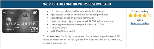 前四個月花費2,500美元,可在希爾頓酒店享受兩個免費周末的間夜,當花費超過10,000美元時,該卡還提供旅行中斷保護,丟失行李保險和其他高級保險福利。唯一的缺點是希爾頓積分明顯低于普卡獎勵積分。