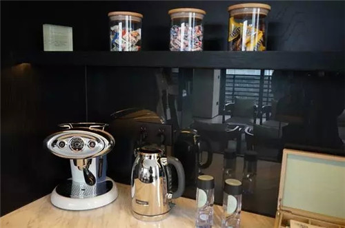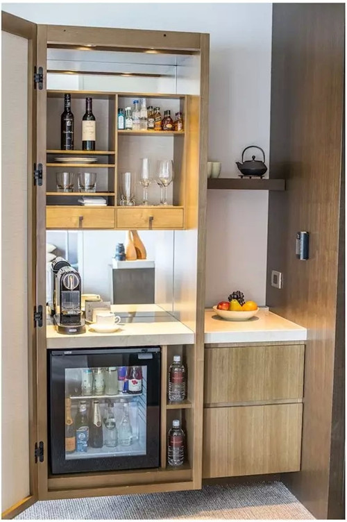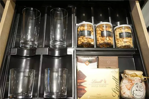 minibar不是迷你的酒吧。從一個(gè)小冰箱開(kāi)始,里面有水(最基本的,還要看品牌和種類)、果汁、軟飲、酒類、糖果等。延伸到吧臺(tái)柜面上和各個(gè)抽屜里,典藏一些酒店精選特色飲料小食,還配備了時(shí)下流行的膠囊咖啡機(jī),各色茶包,各類咖啡杯碟和酒杯等。