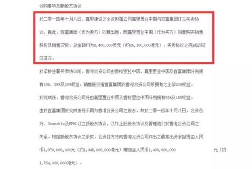 2014年10月8日,宜富集團退出昆明香格里拉大酒店項目,嘉里建設發(fā)布公告,公告顯示嘉里建設全資附屬公司嘉里置業(yè)(中國)有限公司與宜富集團簽訂買賣協(xié)議,以總額約840萬美元(約6510萬港元)收購宜富集團持有香格里拉國際飯店(昆明)有限公司的20%股權。交易完成后,香格里拉國際飯店(昆明)有限公司將僅由嘉里置業(yè)(中國)及香格里拉中國兩家控股,其中,嘉里置業(yè)占股從35%增加至55%,成為香格里拉國際飯店(昆明)有限公司最大的股東。