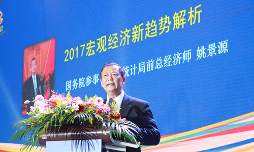 國務(wù)院參事、國家統(tǒng)計局前總經(jīng)濟師姚景源為與會嘉賓解析“2017宏觀經(jīng)濟新趨勢”。