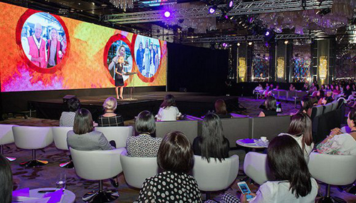 在麗思卡爾頓酒店的鉆石廳里,座位呈扇形擺放,一塊比演講臺(tái)還寬的顯示屏是主要光源之一。這塊屏幕很大,大到會(huì)讓投射上去的明艷色彩顯得更加張揚(yáng),讓鼓舞人心的短句顯得更讓人信服。Beyoncé的歌聲有力地循環(huán)著,“Who run the world?Girls.” (誰(shuí)掌管這個(gè)世界?女生們。)這一切讓人情緒高漲。