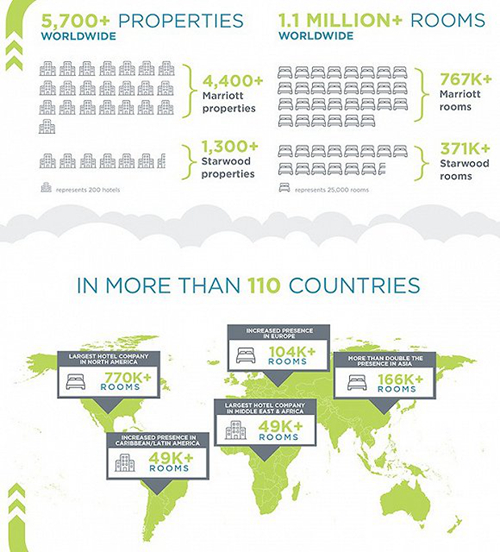 合并喜達(dá)屋后,萬(wàn)豪在全球110多個(gè)國(guó)家和地區(qū)共管理或加盟超過(guò)5700家酒店。 圖表來(lái)源:conventionresortnetwork.com