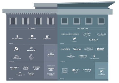 下圖是萬(wàn)豪對(duì)其30個(gè)酒店品牌、度假村俱樂(lè)部和長(zhǎng)住品牌的分類(lèi):