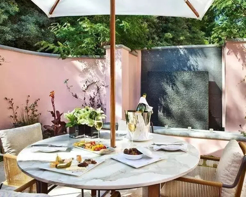 整個酒店的主色調(diào)就是去年潘通公司評出來的年度色——玫瑰石英粉,更多了點布達佩斯大飯店的味道,離比弗利山莊也不遠(yuǎn),總之一切都很夢幻……