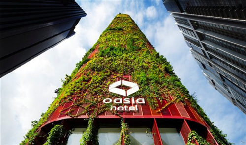 Oasia 酒店被認為是熱帶地區(qū)城市土地集約利用的一個典型案例,它的整體綠地率達到了 1100%。在林立的鋼筋水泥高樓群中,這個酒店看起來格外突兀——它的表面長滿了綠植,給人眼前一亮的感覺。