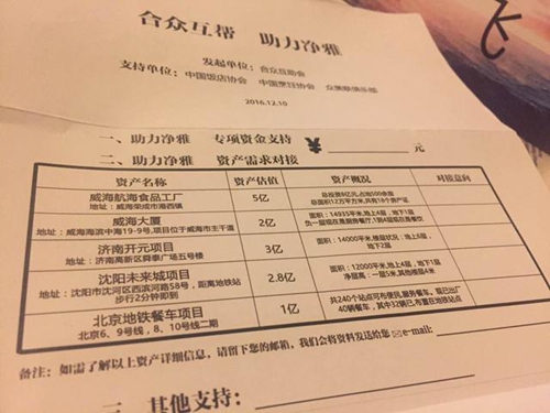 “幫扶計劃”共列出凈雅5項資產,其中威海大廈(建于2009年)、濟南開元項目(建于2010年)和沈陽未來城項目(建于2012年),屬于凈雅自有物業(yè),以前用于經營門店,均位于當地黃金地段,占地面積1萬平米以上,共估值7.8億元。威海航海食品工廠建于2010年,占地500畝,曾用于凈雅海參和魚蝦等海鮮產品的儲藏和初加工,估值5億元。北京地鐵餐車項目是2013年8月凈雅為謀求轉型,通過收購“天天見面”推出的大眾餐飲項目,可在北京240個地鐵站點提供餐車服務。